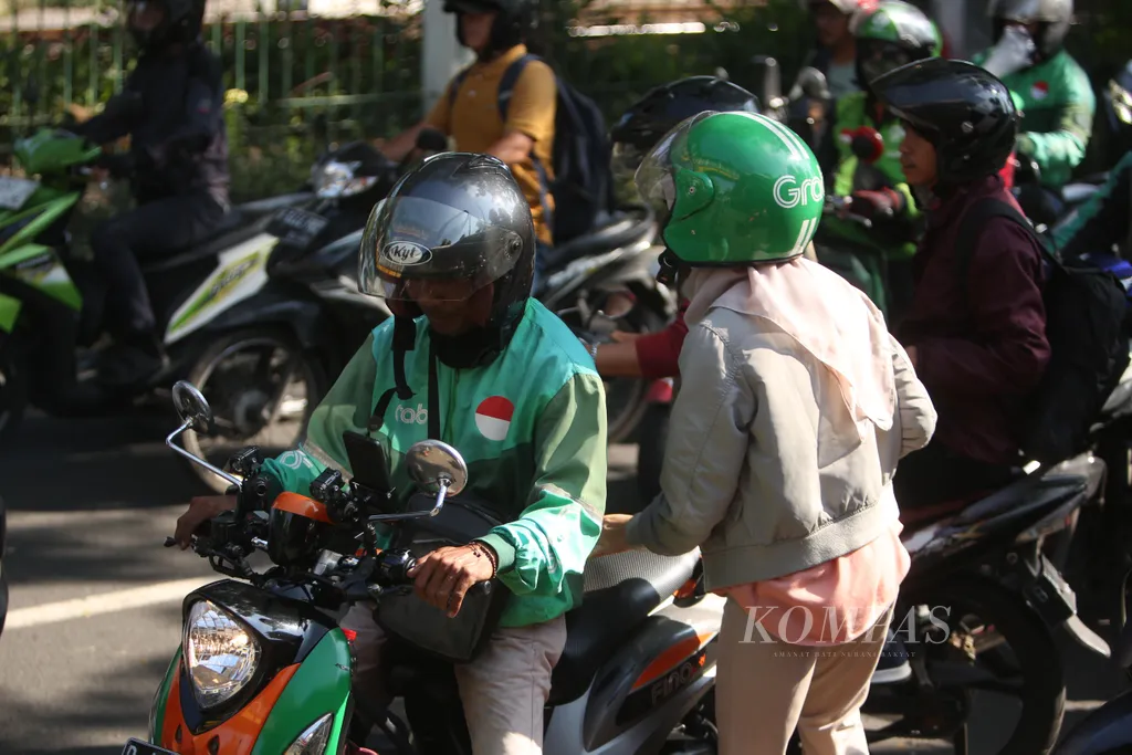 Pengemudi ojek daring menunggu penumpang yang telah memesan jasanya melalui aplikasi di Halte Stasiun Palmerah, Jakarta, saat jam masuk kerja, rabu (2/7/2025). Pemerintah berencana menaikkan tarif jasa angkutan daring roda dua sebesar 8-15 persen, berdasarkan tiga zonasi yang akan ditetapkan.