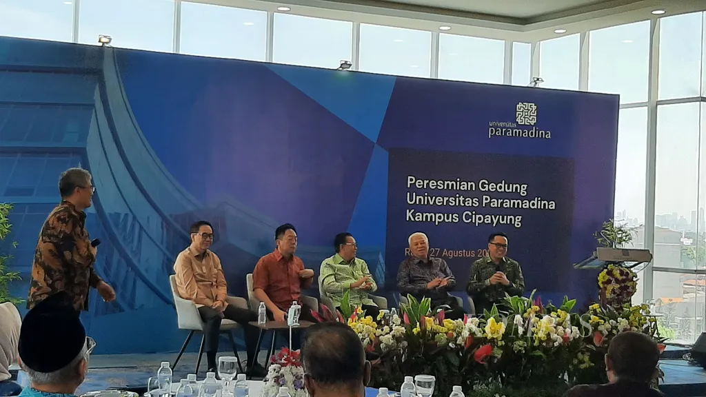 Sejumlah donatur Universitas Paramadina menghadiri peresmian kampus baru di Cipayung, Jakarta Timur, Rabu (27/8/2025). Tampak Direktur Utama PT Djarum Victor Hartono (kedua dari kiri), Direktur Utama GoTo Patrick Walujo (paling kanan), Corporate Secretary & Communication Triputra Group Aminuddin Nurdin (kedua dari kanan), Managing Director Sinar Mas Periode 2000-2021 dan Duta Besar Republik Indonesia untuk Korea Selatan Periode 2021-2023 Gandi Sulistiyanto (ketiga dari kiri), dan Presiden Komisaris PT Astra Intl Tbk Prijono Sugiarto (paling kiri).